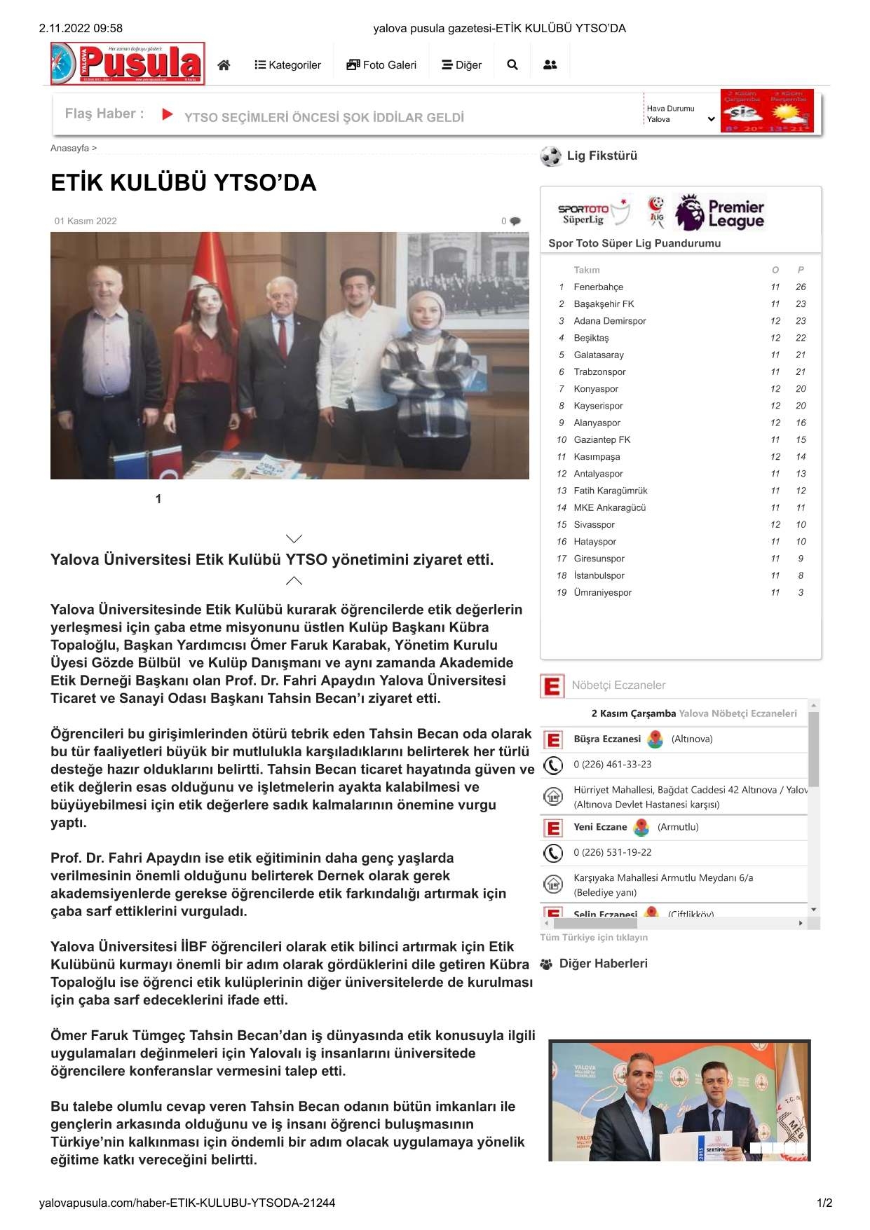 Danışmanlığını AKETDER Başkanı Prof. Dr. Fahri Apaydın'ın yaptığı Yalova Üniversitesi Etik Kulübü öğrencileri Yalova Üniversitesi Etik Kulübünden Yalova Ticaret ve Sanayi Odasına ziyaret etti.